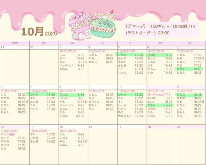 固定ひなた🐣@28hinata_·10月前半お給仕予定👻🎃 今月はいつもよりお休み多めです🙂↕️ 後半もあまりいません! 遠隔┊︎ http://sweetmacaron.official.ec15360