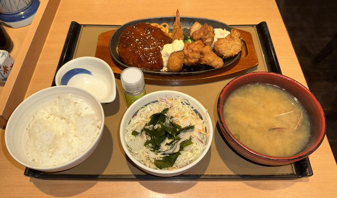 カズ兄@peace091202·どれくらいぶりだろうか😅 久々の やよい軒です😊 で、トリオ定食(ハンバーグ、エビフライ、から揚げ)に貝のお味噌に変更しました👍🏼 たまにはボリューミーな物を食べにゃいとね😋 ほな いただきマッスル💪5147