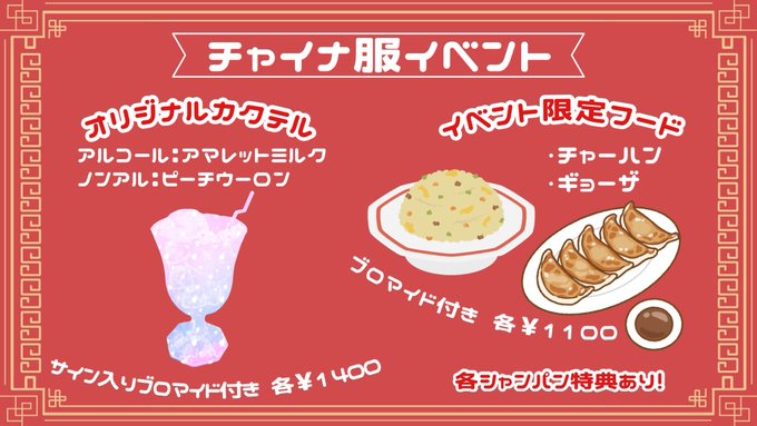 すなお@sunao_macaron·9月17日おはよ~今日からチャイナ服イベント🐼♡すなおは今日しかないので会いにきてほしいよ~~( ߹꒳߹ )ブロマイドゲットしにきて~髪型がんばりたい引用メイドカフェsweet macaron(スイートマカロン)🍬上野・御徒町@sweet_macaron_·9月16日🐼明日からチャイナ服イベント🇨🇳 09.17(水)~09.23(火) メイド達がチャイナ服を着てお給仕します🐼❣️ \サイン入りブロマイド付/ イベントオリカク¥1,400 ❤️ノンアル:ピーチウーロン ❤️アルコール:アマレットミルク \チャイナ服ブロマイド付き/ イベントフード ¥1,100 ❤️ギョーザ ❤️チャーハン2112972