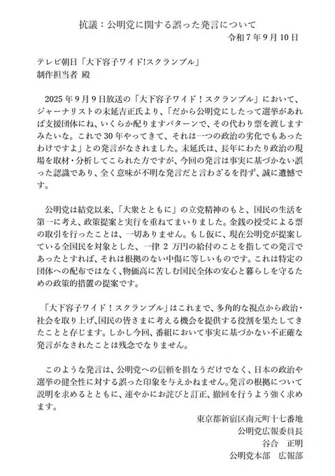 カズ兄さんがリポスト中村ひろやす@naka_hiroyasu·9月11日断固抗議‼️引用公明党@komei_koho·9月11日【公明党に関する誤った発言について】 先日9月9日放送の、テレビ朝日「大下容子ワイド!スクランブル」番組内でのジャーナリストの発言について、番組側に抗議文を渡しました。さらに表示423499
