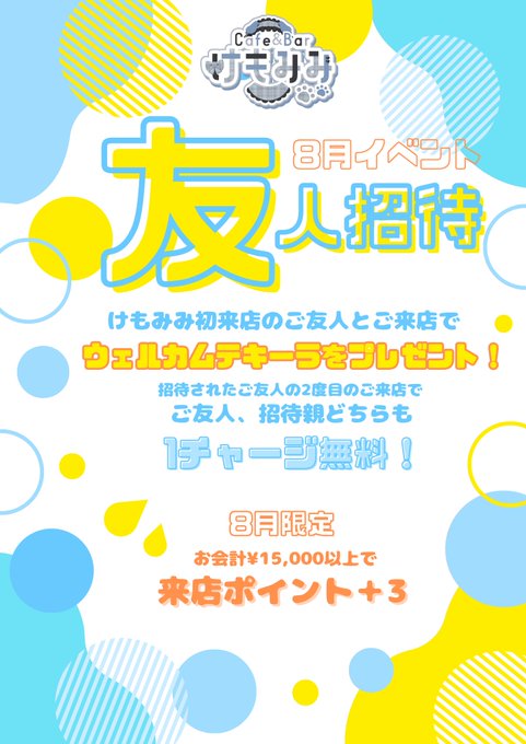 *魔法少嬢セロせろせー*🪼💤@cero_kmmm·5時間8/5 ちらり顔出すのですが、おやすみさせていただきますごめんなさい、、引用Cafe & Bar けもみみ@エンジニア無料コンカフェ@0_kmmm_0·7月31日🌻8月のけもみみ🌻 大好評の 友人招待イベント が復活‼️ 今回の特典は🥃ウェルカムテキーラ🥃 初来店を豪快にお祝いしましょう✨ ‼️さらに‼️ お連れになったご友人が2度目のご来店で、ご友人様、招待親両方に 《 チャージ無料券をプレゼント 》 もっともっとけもみみを楽しみましょう🫶57