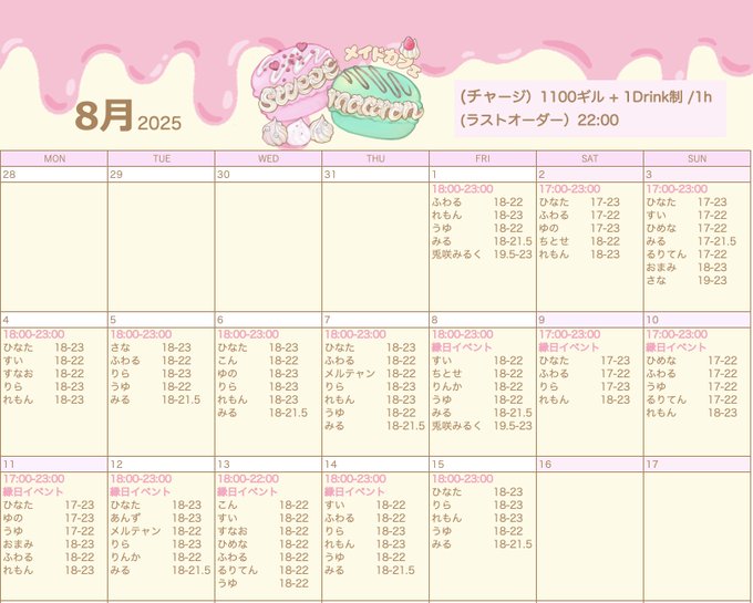 あんず▷7/24 @ sweet macaronさんがリポストメイドカフェsweet macaron(スイートマカロン)🍬上野・御徒町@sweet_macaron_·🎀8月前半お給仕カレンダー🎀 🍬8(金)~14(木) 縁日イベント(浴衣) 🌟ご新規様 チャージ1時間無料🆓お得なスタンプラリーも◎ 🎂お誕生日の方 お誕生日の3日前~3日後までにご帰宅いただけると【当日お給仕してるメイド全員と囲みチェキ&ミニケーキ】プレゼント🎁8101,578