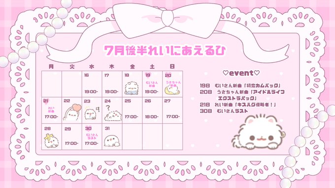 固定れい🪄MeltySwamp@MELSWA_rei·🪄7月後半あえるひリストです🪄 19日▶︎むいさん新曲「初恋カムバック」👶🏻 20日▶︎うさちゃん新曲「アイドルライフエクストラパック」🐰 21日▶︎れい新曲「キスハグ侵略者!」🪄 30日▶︎むいさんラストEV👶🏻218834