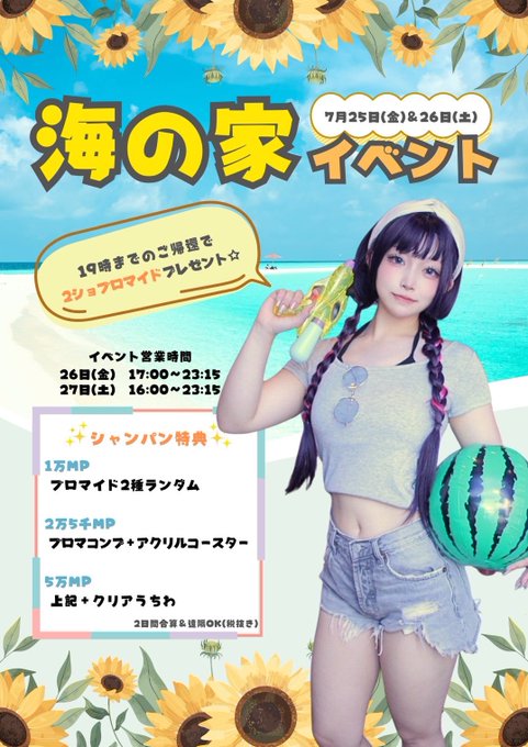 あんずさんがリポストメイドカフェsweet macaron(スイートマカロン)🍬上野・御徒町@sweet_macaron_·2025.7.19~25🏖夏服イベント☀️ \写真入り暑中見舞い付き/ イベントオリカク ¥1400 🌻ノンアル:ラムネアイス×レモンスカッシュ 🌻アルコール:ラムネアイス×パッソアジンジャー \夏服ブロマイド付き/ イベントフード ¥1,100 🌻ガーリックシュリンプ 🌻パインアイスバー&スイカロールケーキ42523