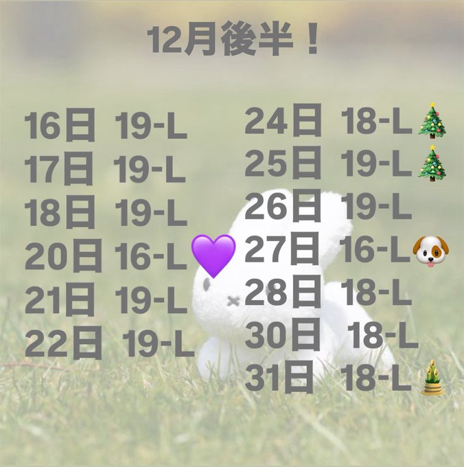 栄・大須・金山 SUGAR&SPICE固定ふわり🐇SUGAR&SPICE@sas_fuwari·🎀 12月後半 お給仕予定 🐇໒꒱ 16日(火) 12~22 17日(水) 12~22 18日(木) 12~22 22日(月) 12~22 23日(火) 12~22 24日(水) 12~22 🎄 25日(木) 12~16 🎄 26日(金) 12~22 🎄 29日(月) 12~22 30日(火) 17~22 🩰 31日(水) 12~22 🩰Mimi 🎄クリスマスEV 🌟5215554