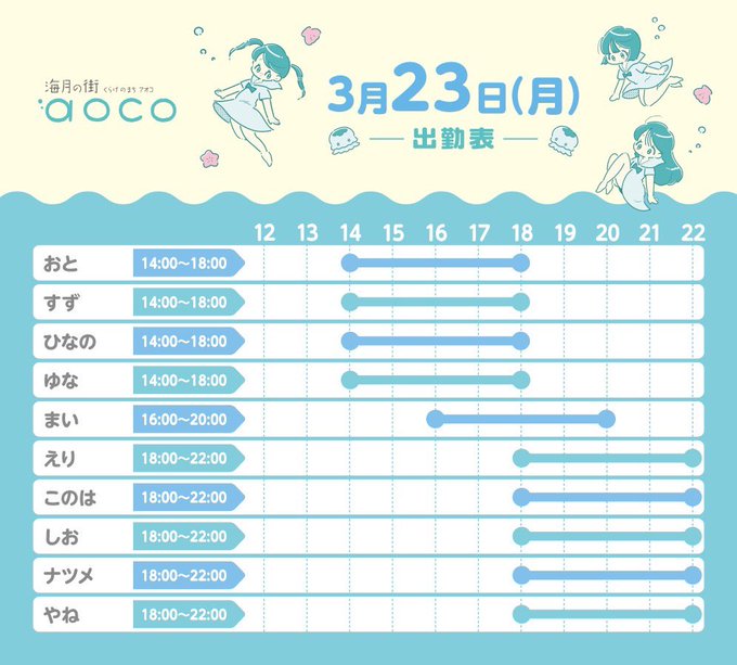 栄・大須・金山 海月の街aoco海月の街aoco ଳ@aoco_osu·9分えりちゃん、このはちゃんお休みです。 20時以降カウンターのみの営業とさせていただきます。ご了承下さい。引用海月の街aoco ଳ@aoco_osu·4時間海月の街aoco 14時オープン🪼 ひなのちゃんお休みです。ご了承下さい。 みなさまのご来店お待ちしておりますଳ #コンカフェ #大須 #クラゲ #名古屋86