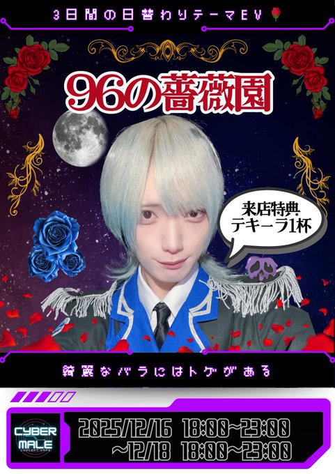 96 🕷️@C_Male_96·4時間薔薇園明日です!🥀引用🌐Cyber_Male🔊名古屋大須メンズコンカフェ@Cyber_Male_·12月14日【⚠緊急 ゲリライベント📷】 ☆日替わりテーマEV☆ 期間:12/16~12/18 イベント、特典詳細は画像を参照ください。 #メンコン #大須 #コンカフェ #名古屋 #メンズコンカフェ #サイバーメールで接続完了2161