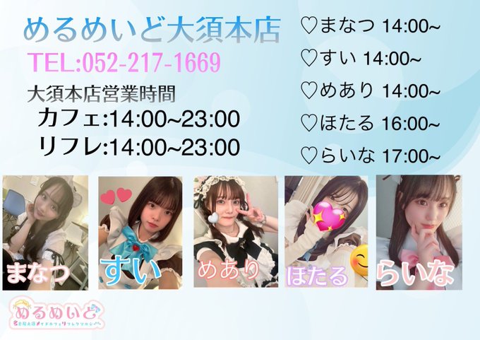 栄・大須・金山 めるめいど固定めるめいど【名古屋大須メイドカフェ/リフレクソロジー】@mellmaid·12月18日(木) 大須本店→14時から ご案内できます💕 【営業時間】 ⭐️大須本店カフェ→14時~23時 ⭐️大須本店リフレ→14時~23時 リフレのご予約は→ 本店☎️ 052 217 1669 14時~ すい @mellmaidsui めあり @mellmaidmeari ほたる @mellmaidhotaru らいな @mellmaidraina まなつ11119
