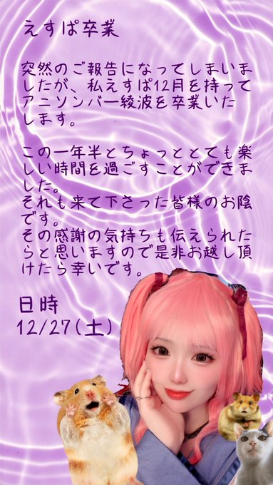 栄・大須・金山 アニソンバー綾波固定えすぱ🍓綾波@HCqp42·こんばんは、えすぱです✨ 色々と立て込んでてご報告が遅くなってしまいましたが… 私、えすぱは12月を持って卒業いたします。 最後に会いに来ていただけたら嬉しいです☺️ #アニソンバー綾波56112