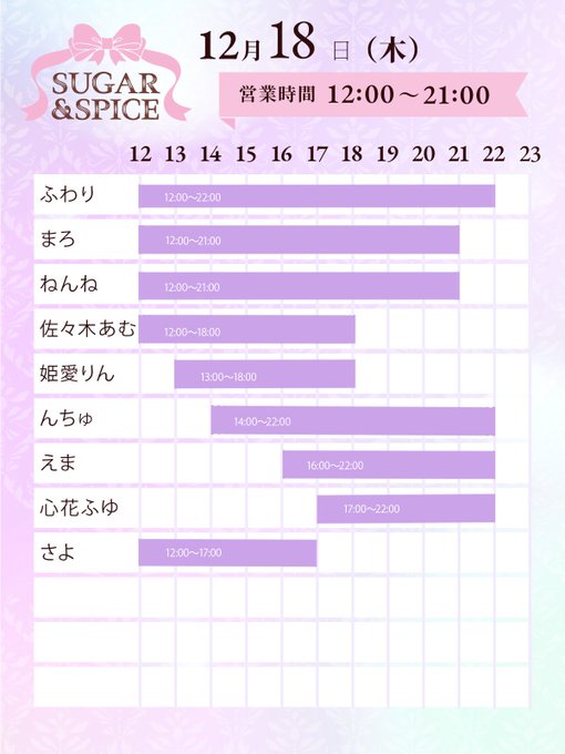 栄・大須・金山 SUGAR&SPICESUGAR & SPICE 大須コンカフェ シュガスパ@sugar_spice_osu·. .°ʚ SUGAR&SPICE ɞ°. 🎀12.17 お給仕表🎀 ご主人様、お嬢様のご帰宅お待ちしております🤍 #SaSお給仕表1:476302