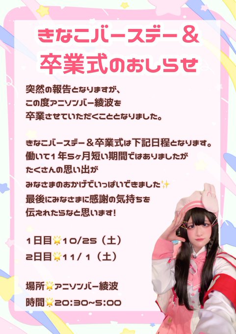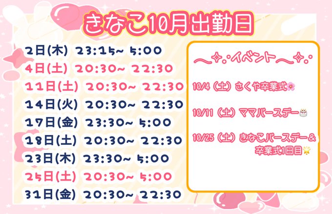 固定きなこてんちょ🐨綾波@mochi_kinako89·きなこ10月の出勤日です🌟 早番多めで日数も少ないですが卒業までがんばるぞ〜❣️ #アニソンバー綾波3133