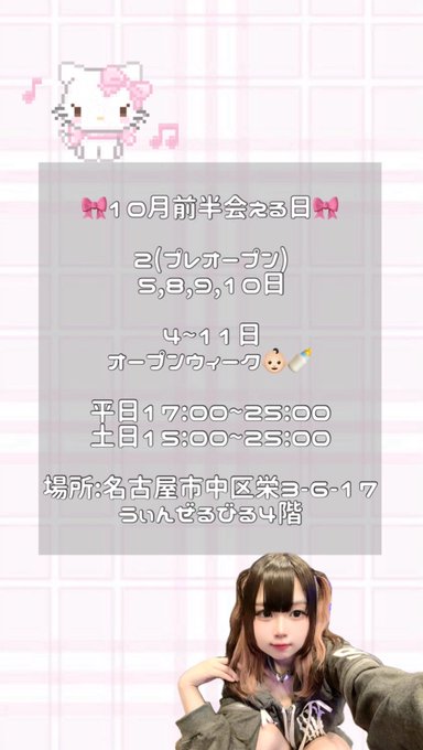 メイギルドエレジア名古屋栄店@eresia_sakae·1時間本日追加出勤情報です!!! 18:00〜23:00 さくら🌸@omaeno_01 ご来訪お待ちしております⚔️引用メイギルドエレジア名古屋栄店@eresia_sakae·14時間【 10/1(水)ギルドメンバー 】 次元の歪みより現れるのは—— 18:00〜23:00 もか🐈@moka_eresia 20:00〜23:00 ぴなみ👧@pinami_eresia ⚔️~異世界酒場~⚔️ ご来訪お待ちしております🎶 #コンカフェバイト #コンカフェ求人178