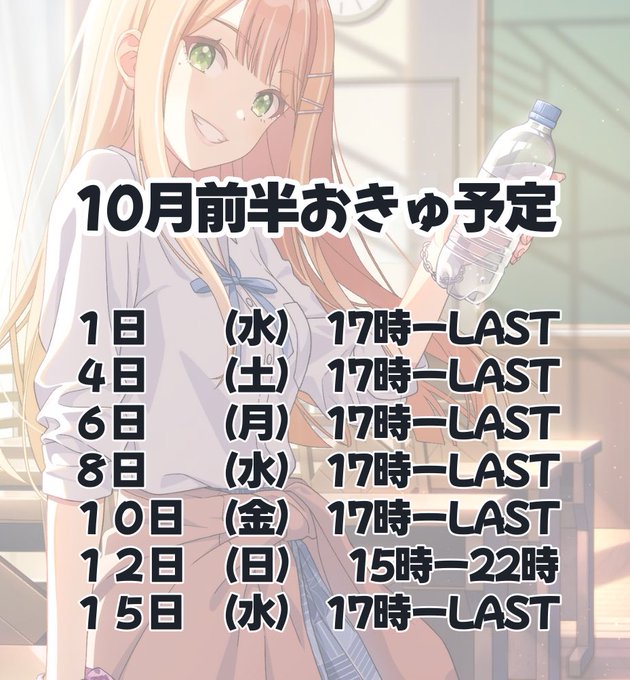 固定ゆま@AQUA_C_Yuma·10月前半お給仕表!! 今月も沢山会えますよーに #自撮り男子 #自撮り界隈 #メンコン #名古屋メンコン15457