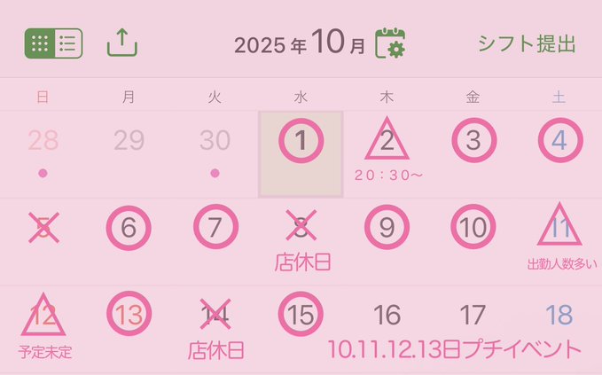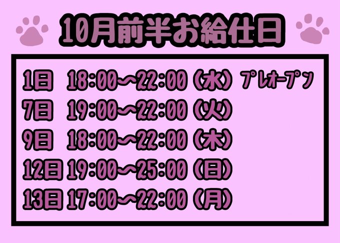 固定さくらなんやが?@omaeno_01·🤍10月前半🤍 予定出勤と前日告知になるので 来店予定ください🌟 ワンチャン行くかも!でも🙆♀️ 当欠減らすのと勤怠よくしよう のチャレンジ週間👶🏻👍🏻 また変更出たら言う3140