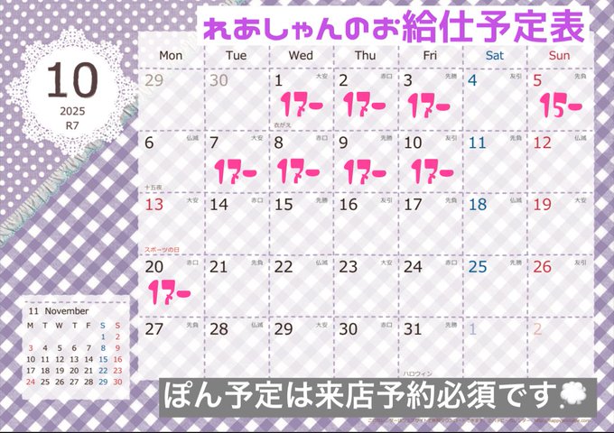 固定なな@PARFUN@nana_parfun·10月前半予定🍁🍂 1日 17-22:30 3日 17-23 4日 17-23 5日 17-23 6日 17-22:30 8日 17-22:30 11日 17-23 13日 17-22:30 15日 17-22:30 11日すずめ生誕🐥🤍ྀི 9月たくさんありがとうございまちたッ❕ 10月もイベントたくさんなので会いに来てくれたら嬉しいよんッ🎀🎀4140