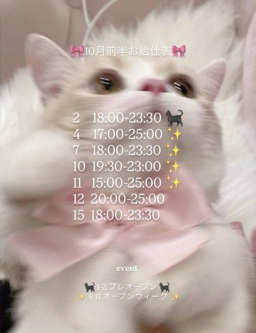 固定さと@ねこらぶ@sato_nekolove·10月前半お給仕表🐱 1日プレオープン!✨ 4日グランドオープン!!✨ 10月4日~10月11日オープンウィークです!!にゃ、にゃんと!特典がもらえます!ぜひぜひ!!!(っ ॑꒳ ॑c) いっぱ〜いいます!!愛に来てね💕︎ #コンカフェ #名古屋コンカフェ #ねこらぶ7126