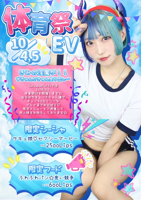 サキュバス シーシャBAR TAILS名古屋店💜@Succubus_Tails·🩵イベント情報🩵 SuccubusTailsでは10/4(土)、5(日)に 体育祭EVを開催します🏆 当日はサキュバスちゃん達が キュート&セクシーなブルマ姿でお出迎え❣️ EVだけの限定メニューもご用意✨ 旅人様の堕落、お待ちしております🩷10131,783
