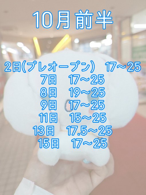 ふわり🐇SUGAR&SPICE@sas_fuwari·🎀 10月前半 お給仕予定 🐇໒꒱ 3日(金) 12:00~22:00 8日(水) 12:00~22:00 9日(木) 12:00~22:00 10日(金) 12:00~22:00 14日(火) 12:00~22:00 15日(水) 12:00~22:00 全てシュガスパです!3117618