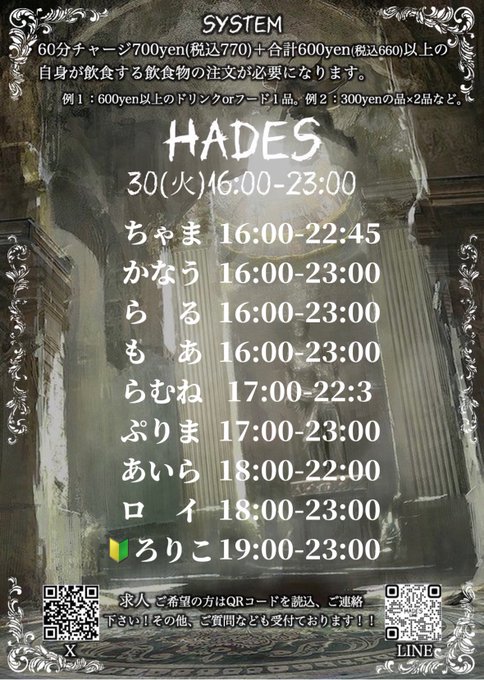 【キャストさん募集中】Concept Cafe HADES【公式】@CafeBar_HADES·48分冥界開きました! ご来店お待ちしてます!! 修正 🔰ろりこ→出勤なし 🔰かりん→19:00-23:00引用【キャストさん募集中】Concept Cafe HADES【公式】@CafeBar_HADES·17時間本日も冥界堕ちありがとうございました!明日の冥界です。キャストいっぱいでお待ちしてます!! #ハーデス #冥界 #大須 #コンカフェ1301