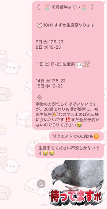 あすみんだネ❗️Lv.12@asumi_oremei·5時間本日発熱のため、お休みです。 9月最後の日にほんとにごめんねー、😭 9月皆勤賞ねらってたのにほんとにしょげ。引用あすみんだネ❗️Lv.12@asumi_oremei·9月2日ཐི♡⃘ཋྀ9月お給仕表ཐི♡⃘ཋྀ181