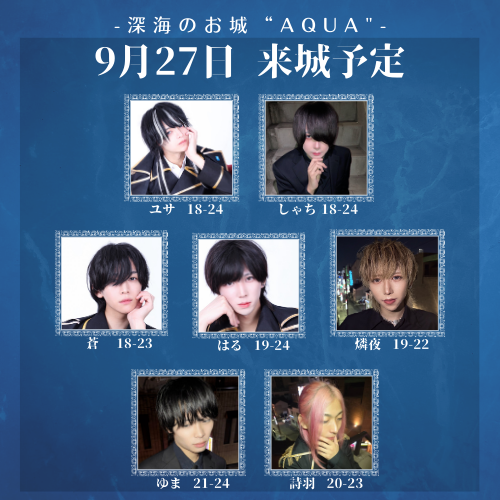詩羽 (AQUA)さんがリポスト深海のお城"AQUA"名古屋メンコン@AQUA_CASTLE_·【来城予定】 初回は必ず顔写真付きの身分証をお持ち頂きますようお願いします 18歳未満は入店できません、ご了承ください ご相談、お席のご予約は公式DMにて承っております ※23時以降のご来城は早締めを行う場合がありますので、ご予約推奨しております #名古屋メンコン #メンズコンカフェ12307