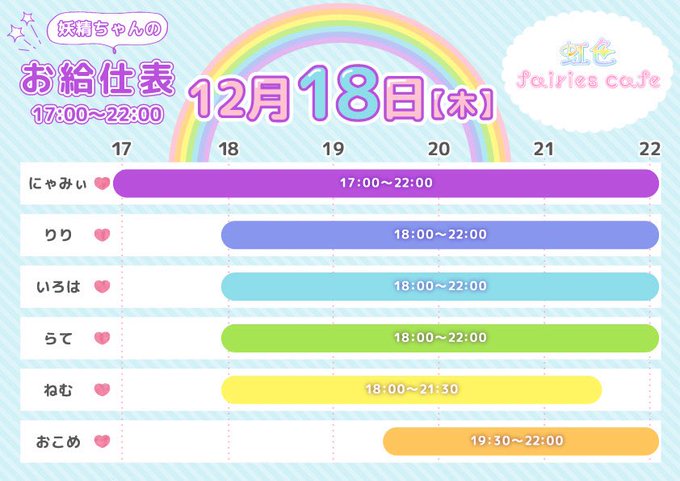 栄・大須・金山 虹色fairies cafe虹色fairies cafe🌈キャスト募集中🧚🏻♀️@nijicafe_osu03·本日水曜日はおやすみです💤 明日12/18(木)は17:00開国! 妖精ちゃん🧚🏻♀️⬇️ にゃみぃ@nyami_nijicafe りり@riri_nijicafe いろは@iroha_nijicafe らて@rate_nijicafe 🔰ねむ@nemu_nijicafe おこめ@okome_nijicafe 旅人の皆さまお待ちしてます🌈 #コンカフェ #大須24133
