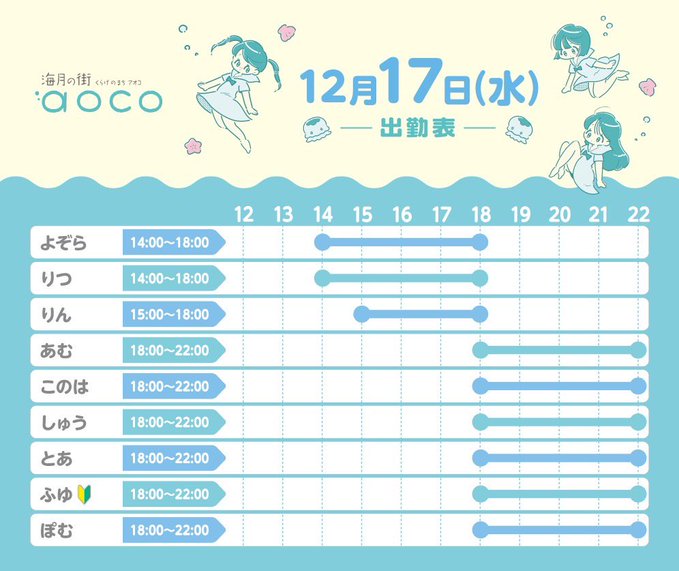 栄・大須・金山 海月の街aoco海月の街aoco ଳキャスト募集中!@aoco_osu·海月の街aoco 14時オープン🪼 本日ふゆちゃん初出勤で教育係しゅうちゃんの予定です!アミュ制限あります。 あむちゃんお休みです、ご了承ください。 みなさまのご来店お待ちしておりますଳ #コンカフェ #大須 #クラゲ #名古屋18595