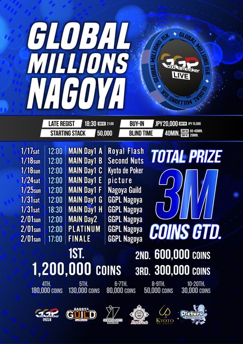 栄・大須・金山 Good Game Poker Live Nagoya【名古屋GGPL】 GoodGame Poker Live NAGOYA@GGPLnagoya·【🔥Global Millions Nagoya Vol.8🔥】 ✨1月開催決定✨ 📈 プライズ大幅UP‼️ 🌏総プライズ 300万coin スポンサード‼️ 👑優勝 120万coin👑 🏯名古屋 × 京都⛩️ ⚔️Day1は 全7回開催⚔️ 回を重ねるごとに加速する グロミリ名古屋💥 この舞台を制するのは誰だ── 皆様の挑戦、お待ちしています🏆🔥さらに表示1236