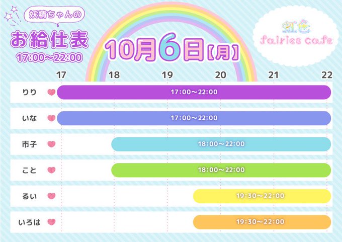 虹色fairies cafe🌈キャスト募集中🧚🏻♀️@nijicafe_osu03·本日もご入国の旅人さまありがとうございました✨ 明日10/6(月)は17:00開国です🌈 妖精ちゃん⤵️🧚🏻♀️ りり@riri_nijicafe いな@ina_nijicafe 市子@ichiko_nijicafe こと@koto_nijicafe るい@rui_nijicafe いろは@iroha_nijicafe 旅人の皆さまお待ちしてます✨ #コンカフェ #大須さらに表示23187