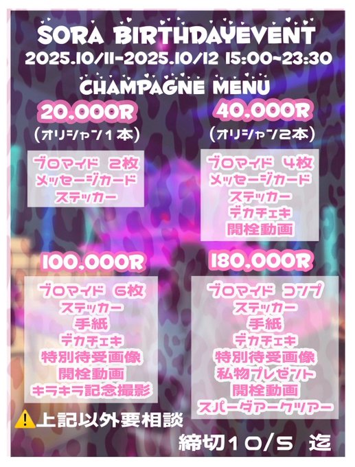 虹色fairies cafe🌈キャスト募集中🧚🏻♀️@nijicafe_osu03·10/11(土)るいちゃんプチ生誕🤍 限定特典が付いた可愛いオリジナルドリンクです🧚🏻♀️✨ この日限定でボトルにもるいちゃんの限定ブロマイドが付きます💛 通常営業内での開催となりますのでぜひ皆さまお気軽にるいちゃん@rui_nijicafe のお祝いにお越し下さい☺️ 旅人の皆さまお待ちしております🌈✨さらに表示289429