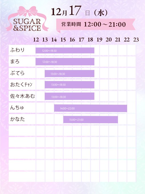栄・大須・金山 SUGAR&SPICESUGAR & SPICE 大須コンカフェ シュガスパ@sugar_spice_osu·. .°ʚ SUGAR&SPICE ɞ°. 🎀12.17 お給仕表🎀 ご主人様、お嬢様のご帰宅お待ちしております🤍 #SaSお給仕表1:4723470