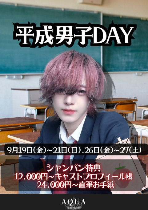 ゆまさんがリポスト深海のお城"AQUA"名古屋メンコン@AQUA_CASTLE_·【9月後半行事】 ✨AQUA平成男子Day✨ 9/19(金)~9/22(日) 9/26(金)~9/27(土) キャストが限定平成男子姿で登場! 豪華ボトル特典にも注目👀 #名古屋メンコン #平成男子572,176