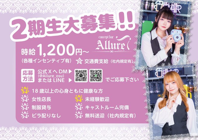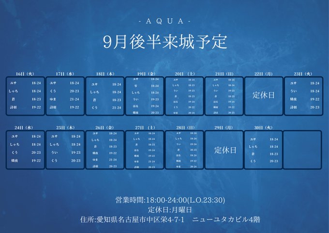Allure(アリュール)︎︎ ︎︎☾ 名古屋大須コンセプトバー@Allure_osu·6時間本日18時より営業いたします☪️ みなさまのご来店お待ちしております🤍引用Allure(アリュール)︎︎ ︎︎☾ 名古屋大須コンセプトバー@Allure_osu·22時間本日もご来店ありがとうございました☪️ 9月16日(火)のお給仕表☪︎ ななせ @7se_Allure 18-L ルナ@Ln_Allure 19-L こはく @kohaku_Allure 19-L まろ @maro_Allure 18-23 #大須コンカフェ #名古屋コンカフェ285