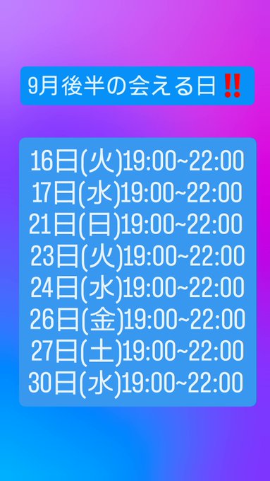 固定ANGEL BABY@AB_ANGELBABY·🍇💧9月後半👼👿 ♡*.☆.。:.+*:°+。..°・*.☆.。:*.♡ 19(金)〜22(月) ポリス👮♂️ E.V. 20(土) さくら @Oirahasakura ゲスト出勤(17-25) 27(土) 私服 E.V. 28(日) あや @AB_aya_ バースデー🎂E.V. ♡*.☆.。:.+*:°+。..°・*.☆.。:*.♡ #ANGELBABY出勤表12131.5万