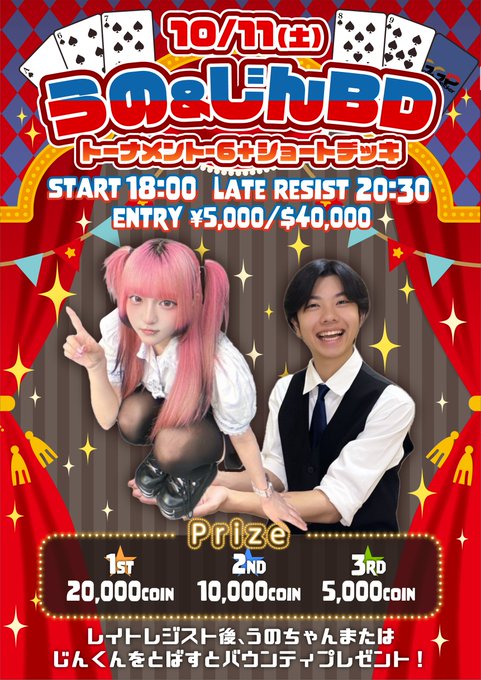 【名古屋GGPL】 GoodGame Poker Live Nagoya@GGPLnagoya·📣ེེྀイベント告知📣ེིིྀ 🎶💕🎀うの&じんBDトーナメント〜6+ショートデッキ〜❤🔥💝💔 ■詳細■ 日付:10月11日(土) 開始時刻:18時00分 参加費:5,000円 レイトレジスト:20時30分 スタートスタック:40,000点 種目:6+ショートデッキ うのちゃん&じんくんを飛ばすとバウンティプレゼント🎁さらに表示501