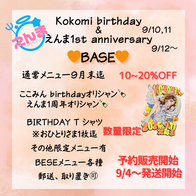 おと🌟えんまさんがリポストえんま🪽名古屋コンカフェ@ENMA_nagoya·9月は ここみんbirthday えんま1周年 BASE予約販売開始🧚♀️✨ 1周年記念 BASE遠隔メニュー10~20%OFF 当日店頭販売もございますが 数量限定売り切れの可能性もあります 予約等 9月末まで受付⭕️ ↓↓↓ http://enmanagoya.base.shopここみ໒꒱えんま🧡9/10.11生誕祭910753