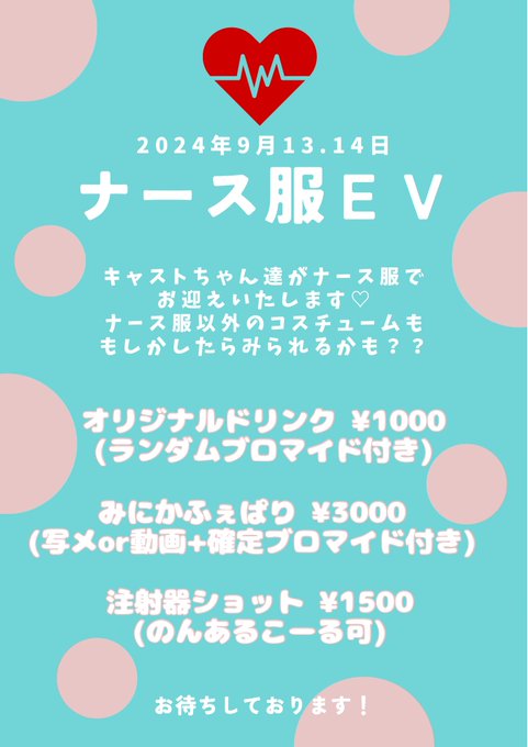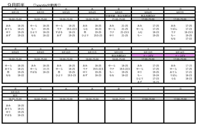 固定χαρτια-カルティア-🃏❤️キャスト募集中@xaptia_concafe·🃏9月前半シフト🃏 月〜金 18:00〜25:00 土日 17:00〜25:00 9/12.13 ナースEV💉🩷 9/5 営業短縮 21:00-25:00⚠️ 毎週金曜土曜(他イベント日除く)飲み放題DAY🍻🫧 🔽 今後のイベント予定 ・9/27 柊BDEV(後日詳細発表)34843