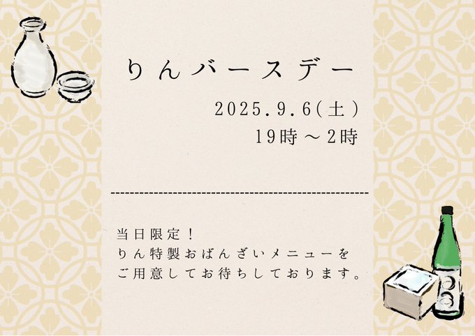 DRESS ゆず🧸🍼さんがリポストコスプレバーDRESS@cosplaybardress·【プチEV情報】 ❤️りんバースデー❤️ 2025年9月6日(土) 19時~2時 ※状況により、りん が早上がりの可能性があります。 ・りん特製おばんざいメニュー🍽 ・限定日本酒🍶 #りんバースデー35719