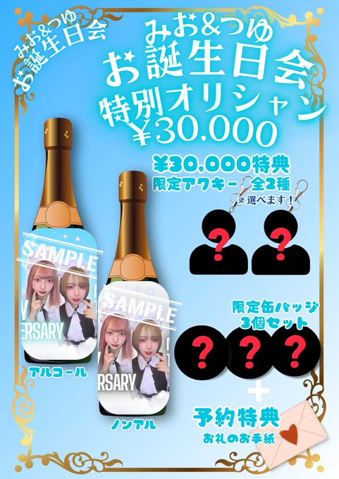 みお🪽9/13(土)お誕生日会@mio_oremei·8月23日よかったら限定オリシャンゲットしてほしいな🥺引用おれのメイド。@名古屋駅前メイドカフェ&BAR💫@orenomaid·8月14日返信先: @orenomaidさん, @mio_oremeiさん, @tuyu_oremeiさん2, 【✨限定オリシャン✨】 みおちゃんつゆちゃんのお誕生日会限定オリシャンです! 数量限定になるためお早めのご予約をお願いします🙇♂️ 予約期間: ~ 9/1 お席の予約、予約特典の限定缶バッジ、¥30,000〜ボトル特典の限定アクキーがつきます🥂 DMで みお @mio_oremei つゆ @tuyu_oremeiさらに表示3308