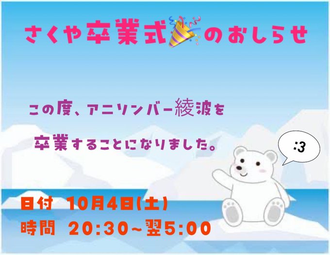 えすぱ🍓綾波さんがリポストさくや😎レペゼン綾波@Sakuya_love1119·突然ですが!!! 10月にさくや卒業します!! 初めてのバイトが綾波で良かったとずーっと思ってます!! みなさんには、感謝しかないのでこのイベントで日頃の感謝をいっっっぱい伝えたいと思っているので、是非さくやの卒業式に来てください!! #アニソンバー綾波9221,365