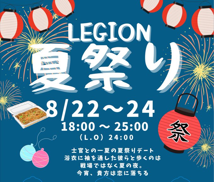 ܰ LEGION ܱ 栄男装コンカフェ@LEGION_sakae·【特別任務発令】 対象:全協力者・捜査官 期間:8/22-24 18:00-25:00 任務内容: 浴衣に身を包んだ士官たちと共に、 夏祭り演習へ参加せよ。 花火と祭囃子に紛れ、士官との距離を縮めることが今回の作戦目的だ。 ──繰り返す。 本作戦は特別任務である。 参加を望む者は、速やかに基地へ集結せよ。21229,583