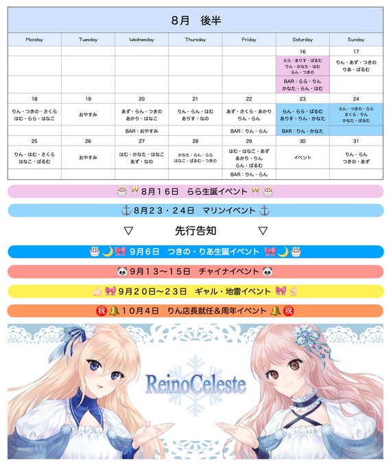 固定ReinoCeleste@_Reino_Celeste·8月後半の予定 🌨 16日(土) ▷▶ らら生誕イベント🥂🎂🎶 23日(土)・24日(日) ▷▶マリンイベント⚓ [営業時間] 平日・祝 15:00〜22:00 土日 14:00〜22:00 お待ちしております ☁️𓈒𓏸 #レイセレちゃん1111,193
