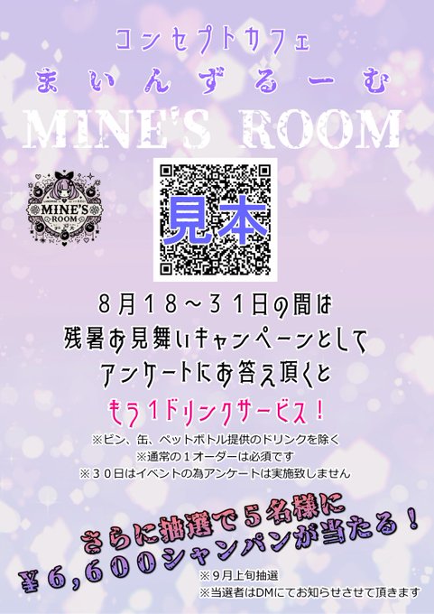 ゆきめ@まいんずるーむさんがリポストまいんずるーむ【公式】地雷系コンカフェ🍾キャスト募集中@mines_room·〜31日は残暑お見舞いキャンペーンとしてアンケートにお答え頂くと1ドリンクサービスです🧋 さらにお答え頂いた方の中から抽選で5名様にシャンパン当たります🎯 よろしくお願いします😊 ※おひとり様1回とさせて頂きます ※30日はイベントの為実施しません2124,237