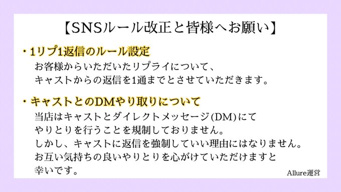 にこさんがリポストAllure(アリュール)︎︎ ︎︎☾ 名古屋大須コンセプトバー@Allure_osu·【SNSルール改定と皆様へお願い】 お客様もキャストも楽しめるお店にしていくために、ご一読ください。 ご協力よろしくお願いします🙇♂️14373,478