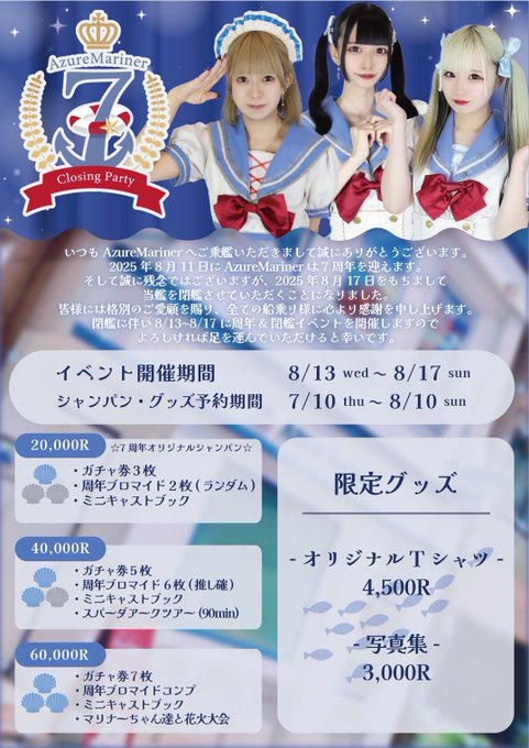 Azure Mariner (アズールマリナー)名古屋店@AzureMariner·#AzureMariner 本日もご乗艦いただき ありがとうございました🛳️🌟 \ LAST / ♡みゅう ♡蒼空🪄 アズマリ8周年&閉艦EV シャンパン&グッズの予約は 8/10(日)締切です🥂 店頭or公式DMまで お願い致します! 明日も17時にOPENします! 明日も船乗り様のご乗艦 お待ちしております🛳️🌟さらに表示6112