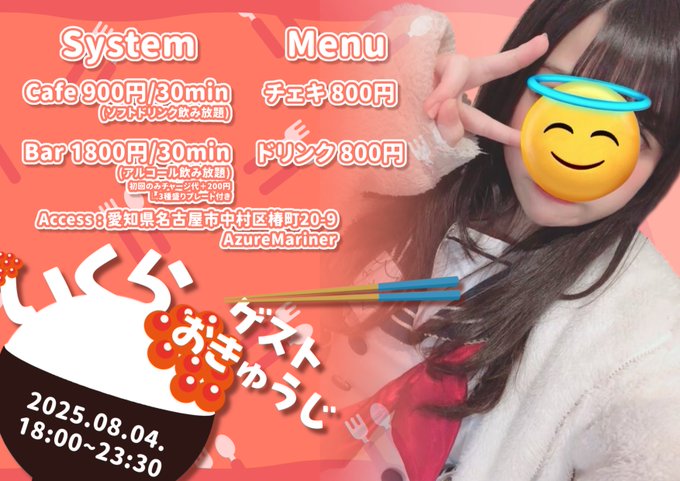 Azure Mariner (アズールマリナー)名古屋店@AzureMariner·7時間引用Azure Mariner (アズールマリナー)名古屋店@AzureMariner·7時間【🐟いくらゲストお給仕🥢】 🚩8/4(月) 18:00~23:30 いくらちゃんが5年ぶりに アズマリに来てくれます🚢✨ 限定復活するいくらちゃんを ぜひ見に来てくださいね💕 #名古屋 #コンカフェ #名古屋駅 #名駅 #ゲスト出勤 #名古屋コンカフェ13367