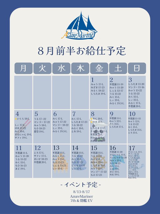 固定Azure Mariner (アズールマリナー)名古屋店@AzureMariner·\ 8月前半 マリナーお給仕予定 / ーイベント予定ー 🥢8/4 いくらゲストお給仕 🐬8/8 あんのあゲストお給仕🐼 🚢8/13-8/17 AzureMariner 7th&閉艦EV ※お給仕予定が急遽変更となる場合があります。各マリナーの個人アカウントにて確認をお願い致します。 #AzureMarinerお給仕予定表 #コンカフェさらに表示149993