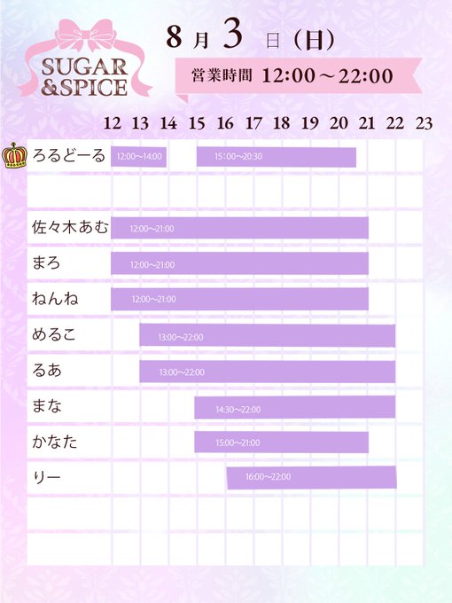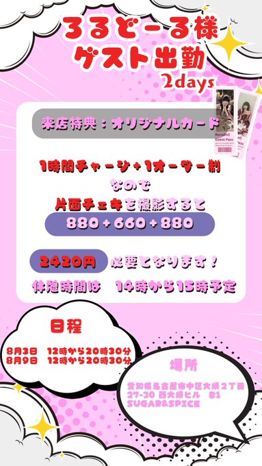 🔰るあ🍼Mimi@sas_rua8·2時間体調全然回復しなくて今日もおやすみ頂きます、泣引用SUGAR & SPICE 大須コンカフェ シュガスパ@sugar_spice_osu·3時間. .°ʚ SUGAR&SPICE ɞ°. 👑08.03 お給仕表👑 ろるどーるさん🩷 ゲストイベント❕ ご主人様、お嬢様のご帰宅お待ちしております💕 #SaSお給仕表 #SaSイベント x.com/sugar_spice_os…1:44213376