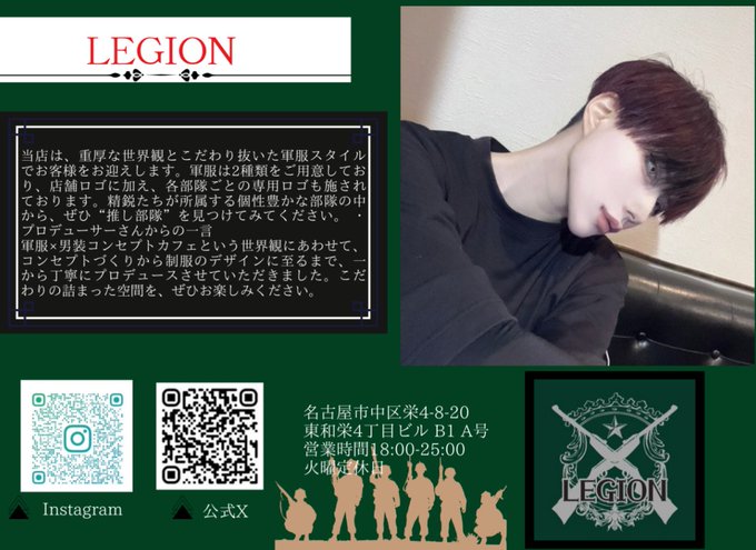 糸冬@LEGION@LEGION_owari·上番します♱ 20-23まで!♱ 月曜日週始めですがよろしくお願いします🫶🏻 #軍事機関LEGION #男装コンカフェ #栄コンカフェ113122