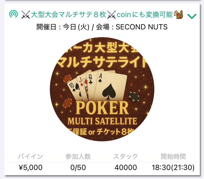 SECOND NUTS♧セカンドナッツ♤ポーカー♡名古屋 栄@SecondNutsPoker·7月22日🐿️大型大会マルチサテライト8枚🐿️ 現在13名様で進行中👥🔥 👥 13/25E Ave. 80000 Blinds 800/1600 レイトまで残り15分切りました‼️ ご参加遅れないようお気をつけ下さい🙇 オキバケはこちらから📞 08036505455引用SECOND NUTS♧セカンドナッツ♤ポーカー♡名古屋 栄@SecondNutsPoker·7月22日⚔️大型大会マルチサテライト8枚⚔️coinにも変換可能🐿 🕡 スタート 18:30 🕒 クローズ 21:30 (受付終了) 💰 参加費 ‼️シングル、ダブルなしのエントリー5000円‼️ エントリー:¥5,000 / 40,000点 リエントリー:¥4,000 / 40,000点 レイトアドオン:¥2,000/20,000点4963